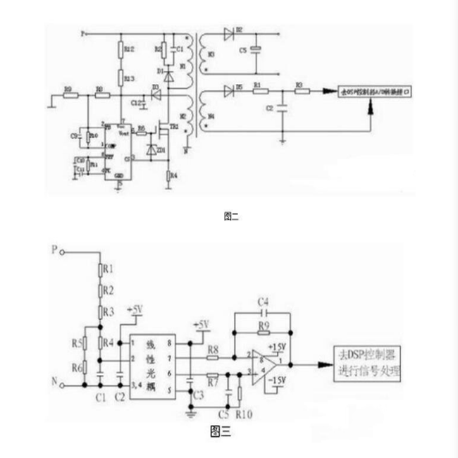 直流母線電壓的讀取,驅動器CPU無法讀取很高的電壓,所以必需得通過電路轉化將高電壓轉化為CPU可以讀取的低電壓,常見的有變壓器輸出讀取法和電阻降壓讀取法,見圖二,圖三。